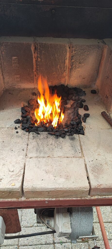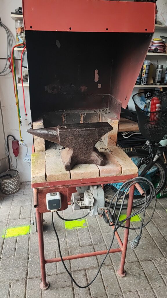 Es gab also einen gebrauchten 35 kg Amboss und eine kleine gebrauchte, selbst gebaute, Esse. Bei der Esse gab es noch einen sehr kleinen Rest Schmiedekohle (Fettnuss No.4) mit. So konnten wir auch gleich einen kleinen Versuch starten. Dank des eingebauten elektrischen Gebläse klappte das anfeuern recht gut. Nur nicht vollgas dann geht nichts.